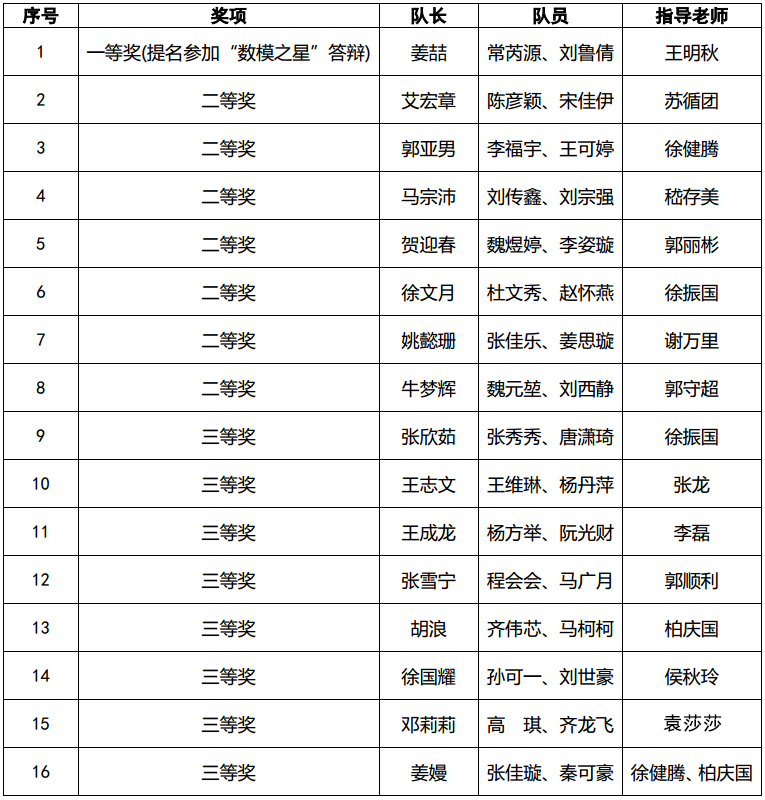 研究生处讯 近日,“华为杯”第二十一届中国研究生数学建模竞赛成绩揭晓,米兰官方网站研究生在比赛中再创佳绩,荣获全国一等奖1项(提名参加“数模之星”答辩)、二等奖7项、三等奖8项。与去年相比,获奖数量增长6项,提高幅度高达 60%,获奖质量和获奖数量均取得历史性突破。其中,由王明秋老师指导的研究生姜喆、常芮源、刘鲁倩团队获得“数模之星”答辩提名,获此殊荣的队伍全国只有13个(占比为0.06%)。