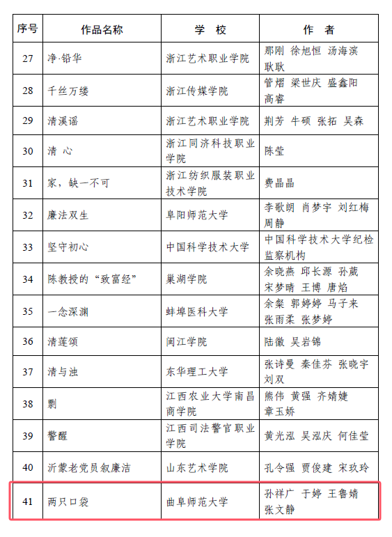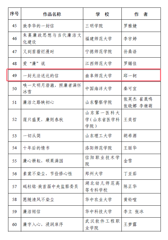 曲师大纪委讯 近日,教育部公布第九届高校廉洁教育系列活动获奖结果,米兰官方网站报送的两项作品获奖,《一封无法送达的信》入选“话廉润心”校园征文单元,《两只口袋》入选“视廉清心”视频征集单元。