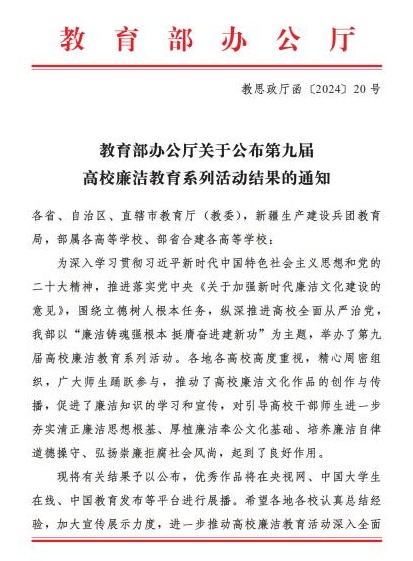 高校廉洁教育系列活动是面向全日制普通高等学校教职工和在校学生征集,旨在推动廉洁文化在校园广泛传播和深入实践的一项全国性赛事。本届活动主题是“廉洁铸魂强根本 挺膺奋进建新功”,共分为“话廉润心”校园征文、“视廉清心”视频征集、“画廉正心”创意征集、“一校一金句”网络微课、课堂实践案例、知识问答等6个单元,每个单元遴选出100件作品。