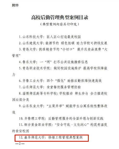 曲阜师大后勤管理处讯 近日,山东省教育厅发布了《关于推介学习高校后勤管理典型案例的通知》,曲阜师大后勤管理处撰写的《修缮工程管理典型案例》成功入选,经山东省教育厅编入高校后勤管理典型案例发布各单位推介学习。