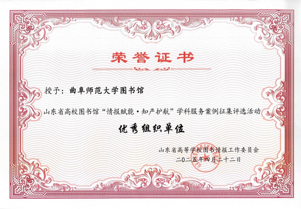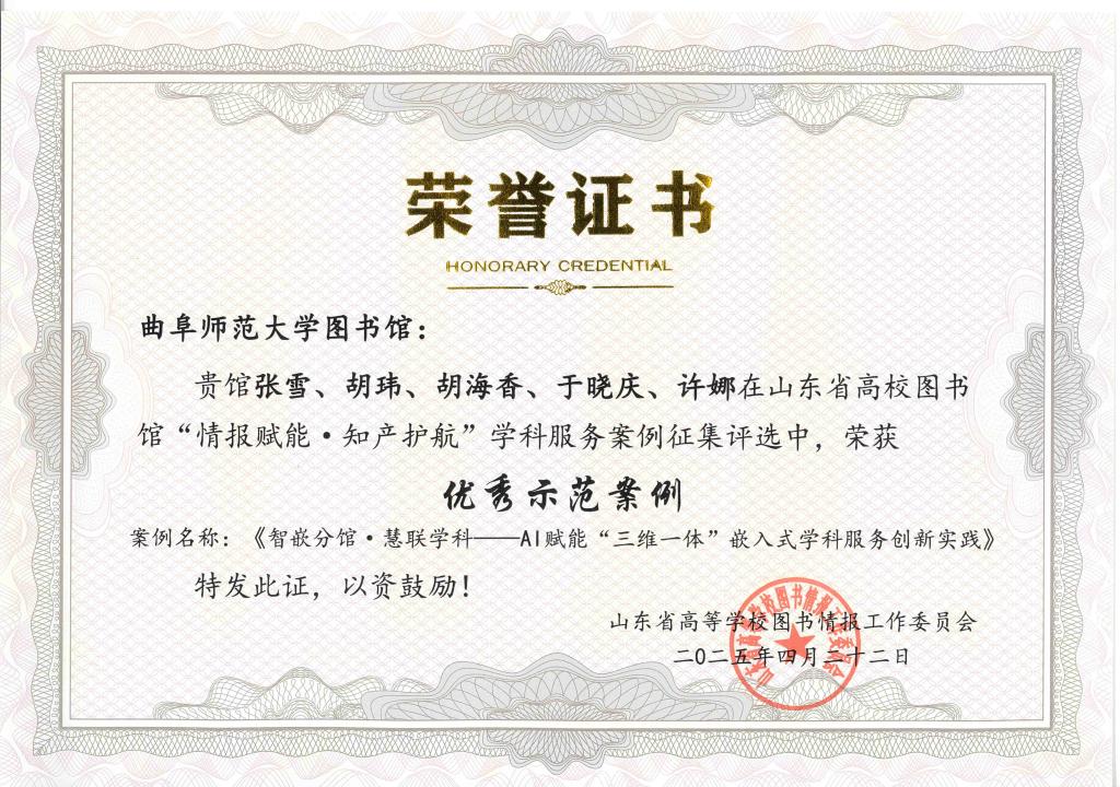 曲阜师大图书馆讯 4月22日,山东省高校图书馆学科服务工作研讨会在中国海洋大学隆重举行。曲阜师大图书馆凭借"智嵌分馆·慧联学科——AI赋能'三维一体'嵌入式学科服务创新实践"项目,在众多参评案例中脱颖而出,荣获"优秀示范案例",米兰官方网站获评"优秀组织单位"。