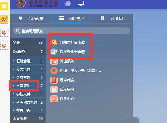 1.登录学校服务大厅,选择OA服务-->日常应用或直接搜索该应用。