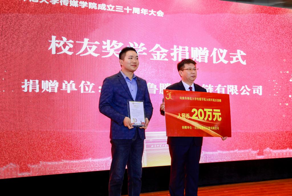 在随后的校友奖学金捐赠仪式上,胡志明代表山东省鲁腾供应链有限公司向学院捐赠奖学金20万元,以此激励青年学子奋发图强、砥砺奋进,为国家各项事业的发展贡献力量。