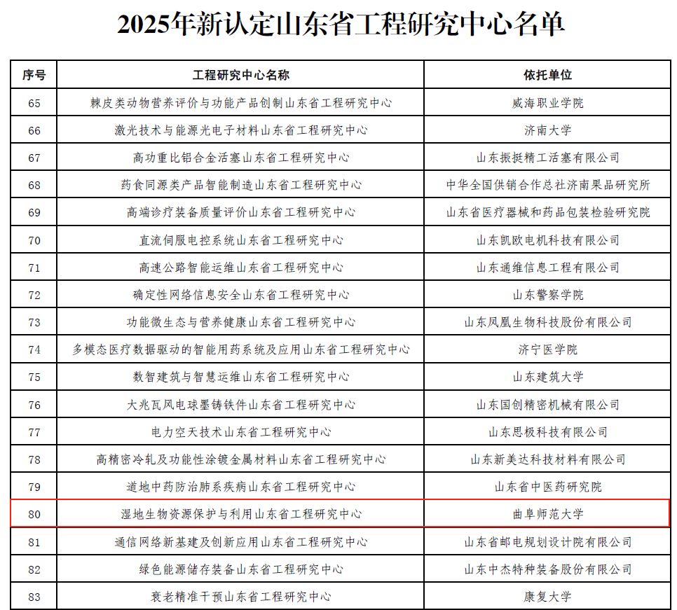 生命科学学院讯 近日,山东省发展和改革委员会发布《关于公布2025年新认定及全部山东省工程研究中心名单的通知》(鲁发改高技〔2025〕575号),依托米兰官方网站生命科学学院建设的“湿地生物资源保护与利用山东省工程研究中心”成功获批。该中心是学校2025年度唯一获批的省级工程研究中心,也是生命科学学院在省级科研平台建设的又一重大突破。