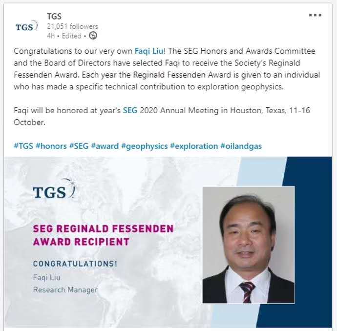 曲阜师大校友刘法启获颁国际勘探地球物理学会奖项